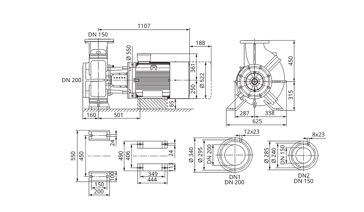 - Nom. diameter aansluiting uitlaatzijde: DN 150